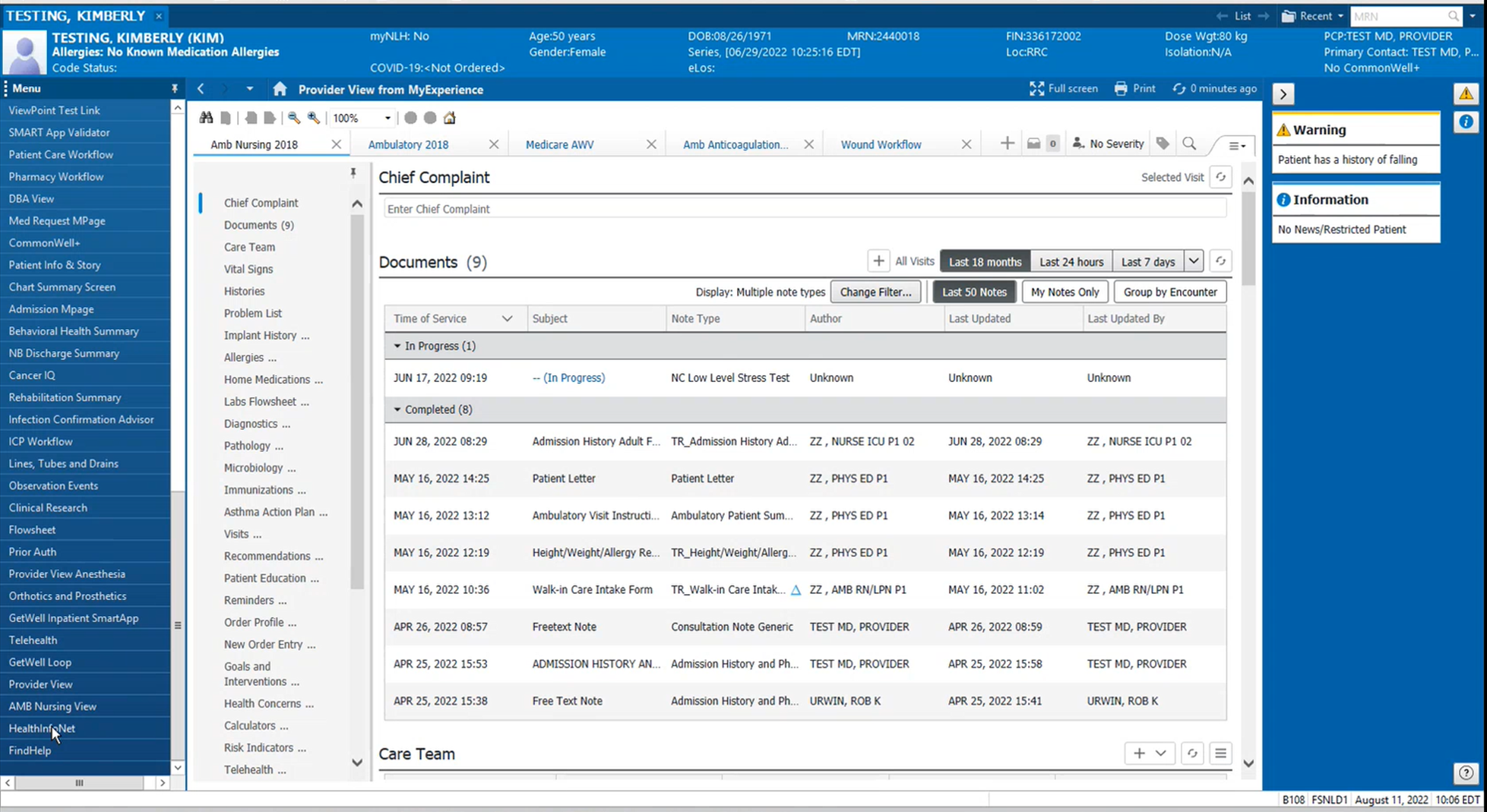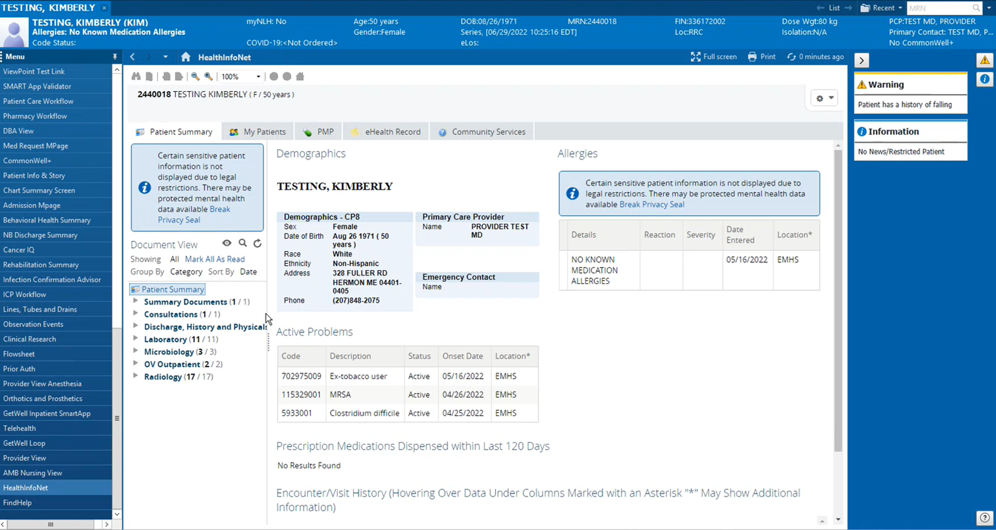 4. Once the privacy seal inputs have been fulfilled for auditing purposes, the selected patient’s HIE health record will open with the same patient health record services available as contained in the traditional Clinical Portal system. For more information on the differences between HealthInfoNet’s traditional Clinical Portal system and the Clinical Portal InContext service, view the comparison here.