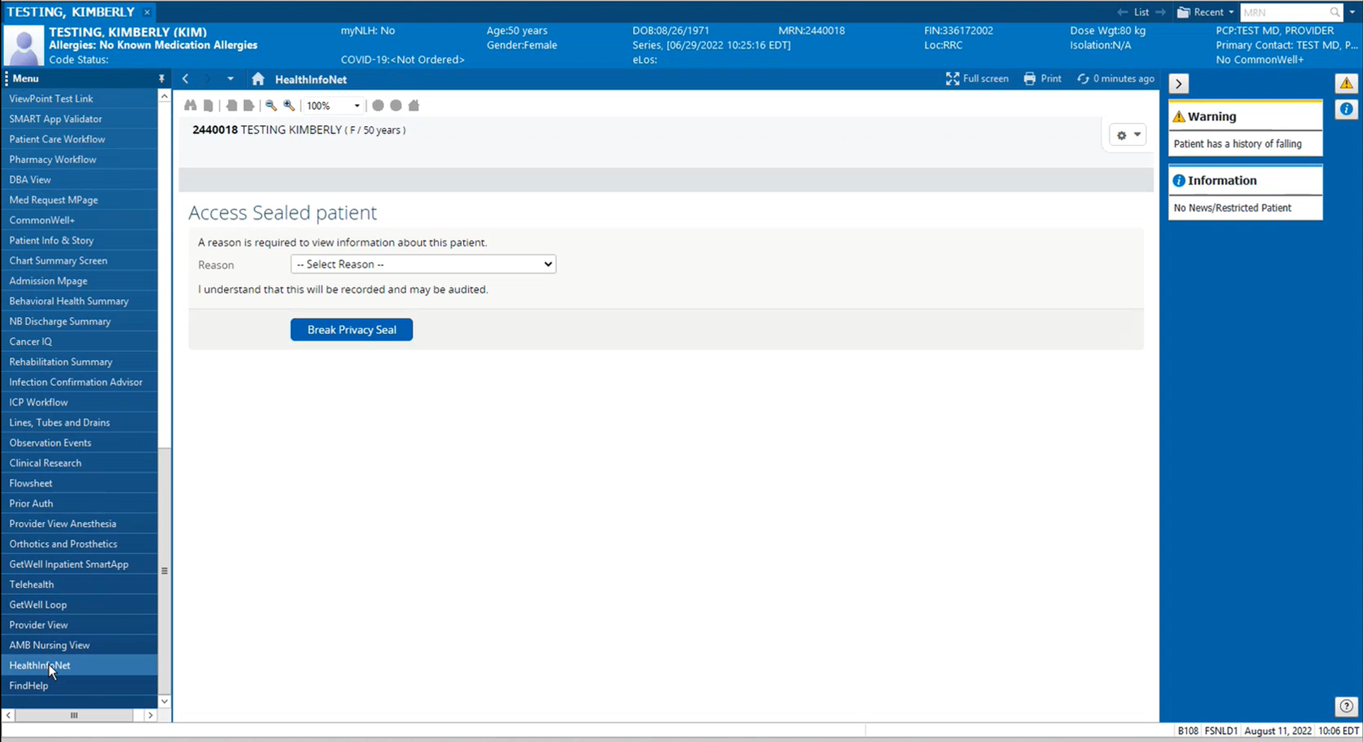 3. Before obtaining access to the selected patient’s HIE health record, break the HIE’s privacy seal by providing a reason for why there is a need to access the record and any additional information that expands on the selected reason.