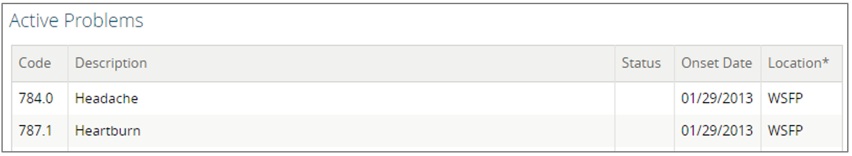 Beneath the "Demographics" component is the "Active Problems" component in the “Patient Summary” view. This component provides a list containing the selected patient's active diagnoses.