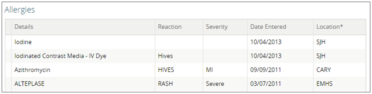 In the upper-right hand corner of the "Patient Summary" view is the "Allergies" component. This component provides a list containing the selected patient's known allergies.