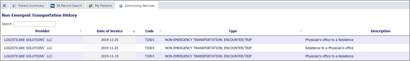 At the top of the "Patient Summary" view, the "Community Services" tab may provide additional social drivers of health information for the selected patient. The section incorporates available data from both clinical and non-clinical organizations that are providing non-emergent transportation, housing support, and other critical services.