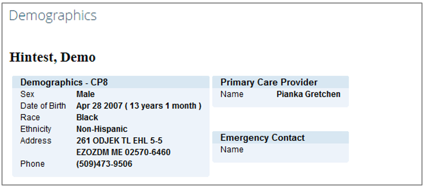 In the upper-left hand corner of the "Patient Summary" view is the "Demographics" component. This component provides additional demographic information about the selected patient.