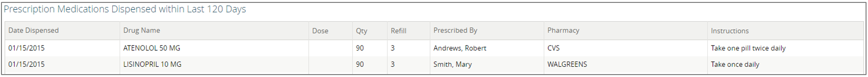 Beneath the "Active Problems" component is the "Medication Management" component within the “Patient Summary” view. This component provides a list containing the selected patient's prescription medications dispensed within the last 120 days.