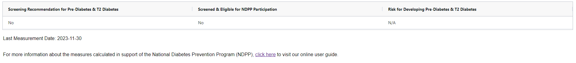 Within the “NDPP” tab, users may find results for the selected patient for three measures developed in collaboration with the Maine CDC and OMS in support of the NDPP. Those measures include: