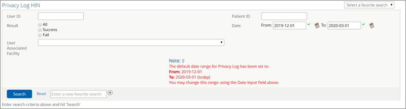 Users can populate the available search criteria to audit either (a) all of the patients that have been accessed by a particular user (User ID, User Associated Facility) or (b) all of the users that have accessed a particular patient (Patient ID) over a given period of time (Date To/From).