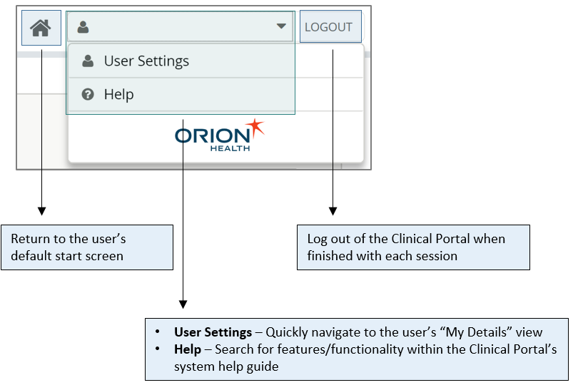 In the upper-right hand corner of the Clinical Portal is the system's "Quick Navigation" functionality. Core components featured in the functionality are outlined below.
