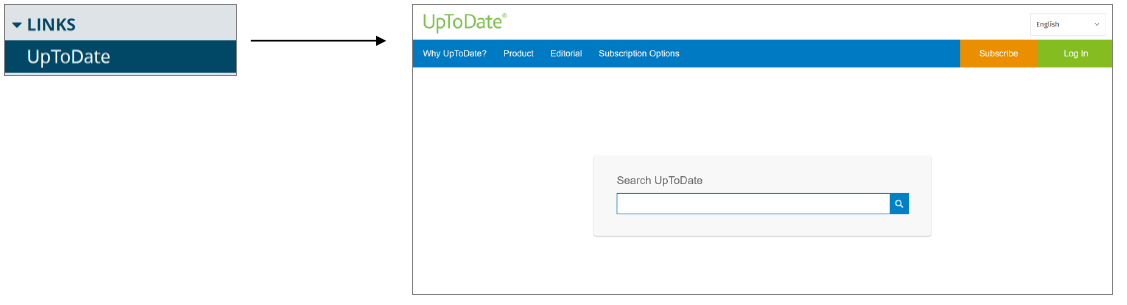 Within the "Links" main navigation function, located on the left hand side of the screen, users may find additional applications and software, such as the "UpToDate" point of care medical resource, depending on their role, organization, and relationship with HealthInfoNet.