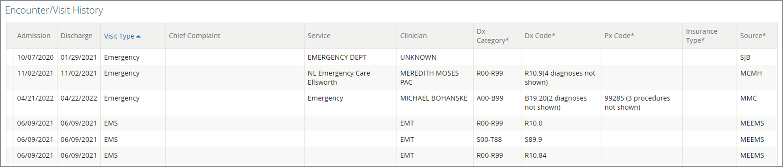 Contents contained in the “Encounter/Visit History” component are by default ordered by most recent Admission Date. But by selecting the title of a particular column, users can sort the column’s contents by grouping like-information together. That way, users can e.g., easily identify all of the same Visit Types in order to evaluate Emergency Department utilization or frequency of EMS calls had by their patients.