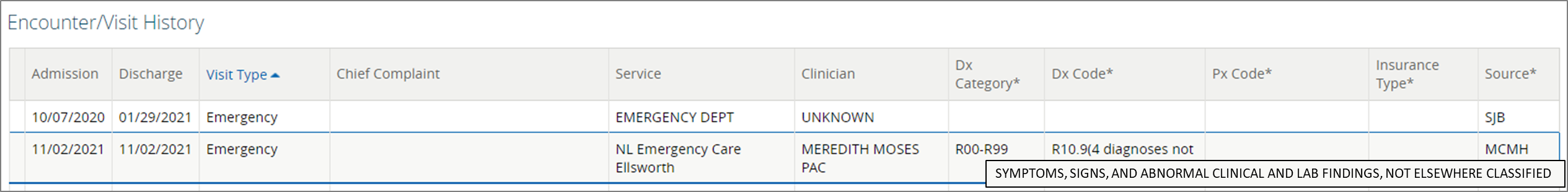 For example, within the “Encounter/Visit History” component, there is an asterisk in the “Dx Category” column. By hovering over a specific ICD-10 diagnosis code in the column (e.g., “R00-R99”), users will be presented with the plain text description of the code (e.g., “Symptoms, Signs, and Abnormal Clinical and Lab Findings, Not Elsewhere Classified”).