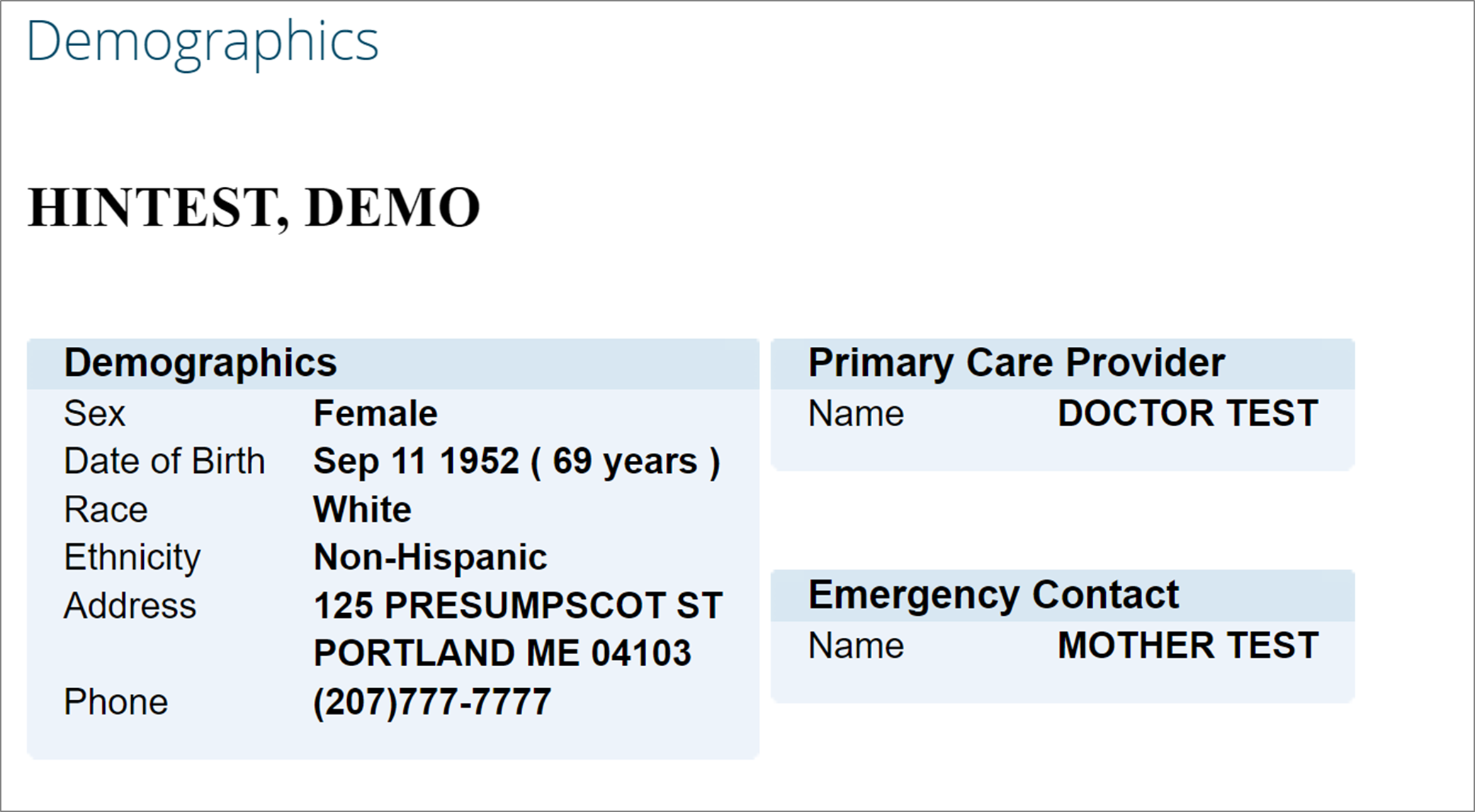 In addition to the patient’s First and Last Names, Physical Address, Phone Number, Primary Care Provider, and Emergency Contact, the following information may also be available: