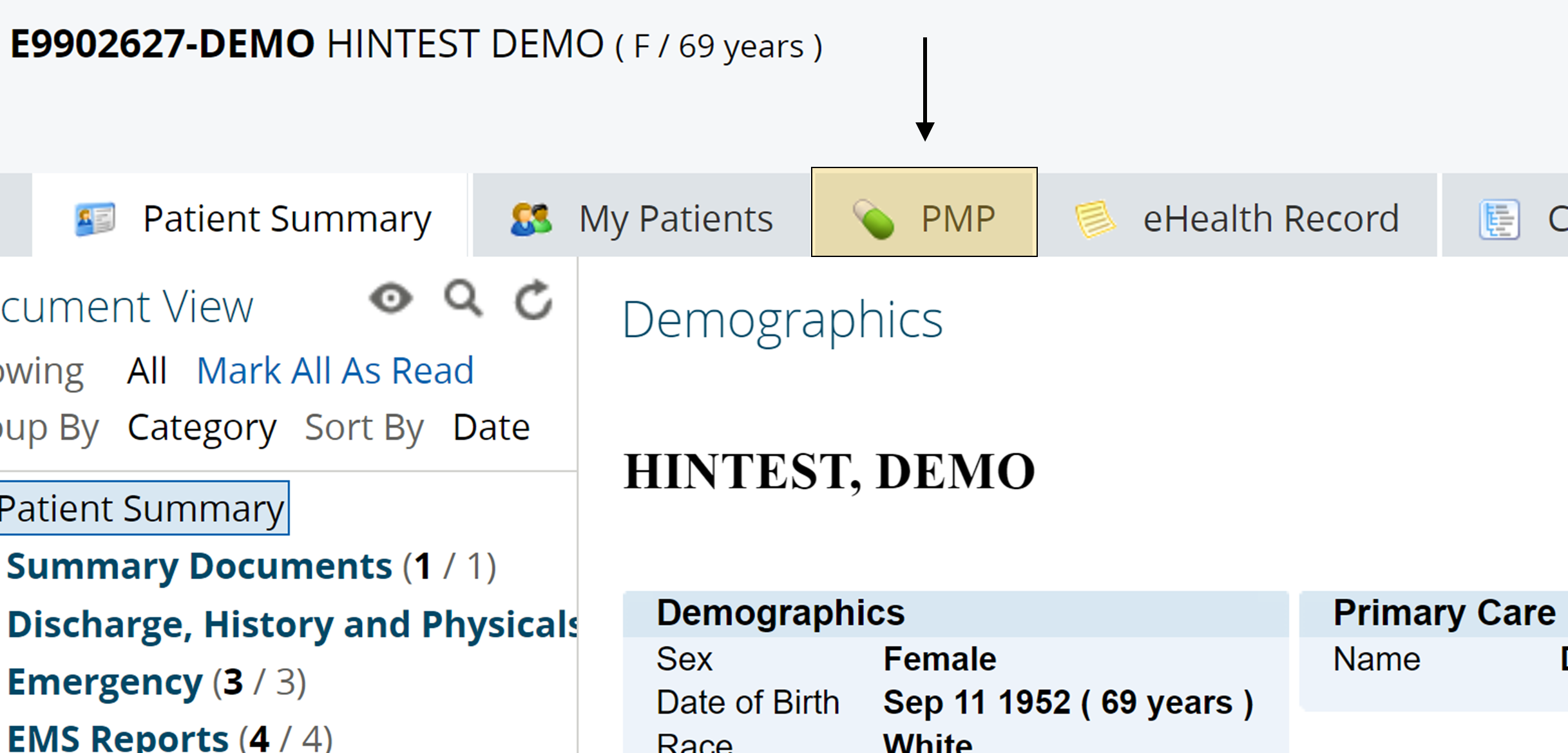For users interested in obtaining information about their patients' controlled prescription medications through the statewide Prescription Monitoring Program (PMP), the Clinical Portal has an integration with the system that is accessible through the “PMP” tab at the top of the “Patient Summary” View.