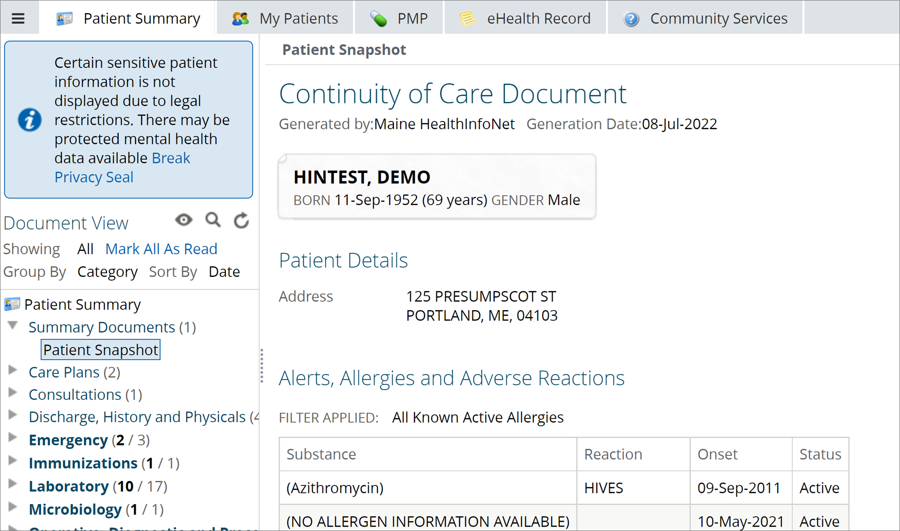At the top of the “Patient Summary” view is the “Demographics” component, where users can identify their patient’s most updated demographic information. This information is updated each time the patient visits an HIE-participating healthcare location and can be used to inform timely and sensitive clinical decision-making and discussions.