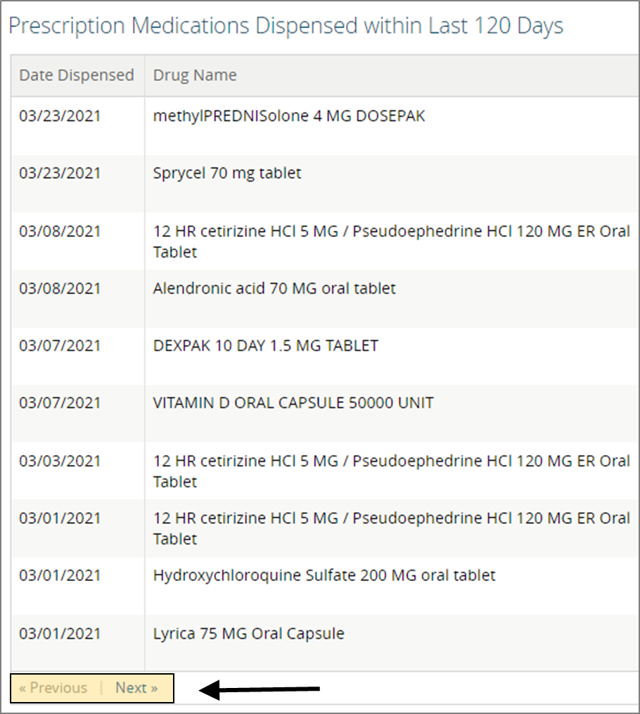 For example, if a user is reviewing their patient’s “Medication Management” component and cannot seem to find what they are looking for, the component may have a “Next” button at the bottom of its table that, once selected, will display additional dispensed medications for review.