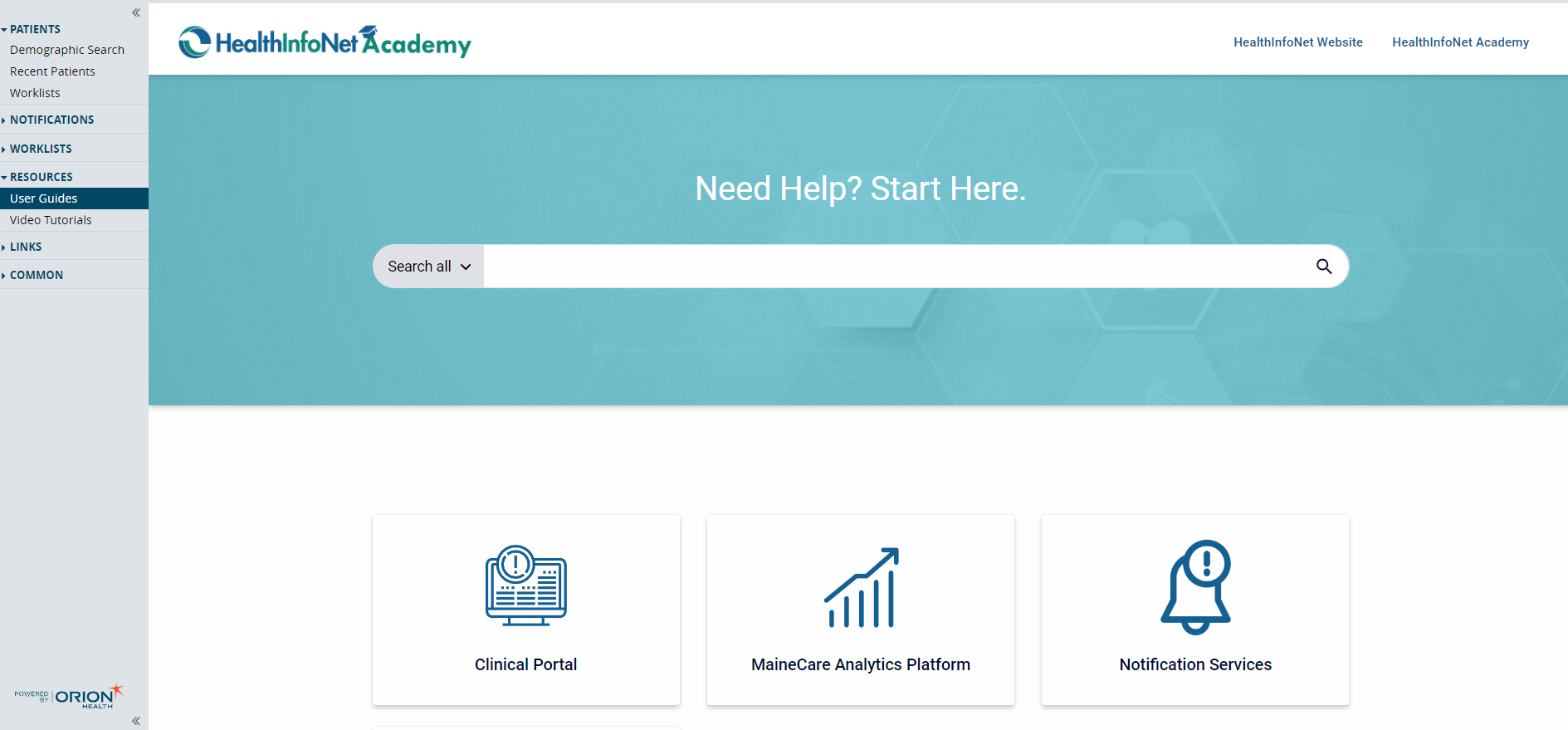 Within the "Resources" main navigation function, located on the left hand side of the screen, users may find additional educational resources developed by HealthInfoNet’s Clinical Education team. These resources are made available through HealthInfoNet Academy, HealthInfoNet’s online learning platform, and include both written user guides (like the one you are reading now!) as well as video tutorials.