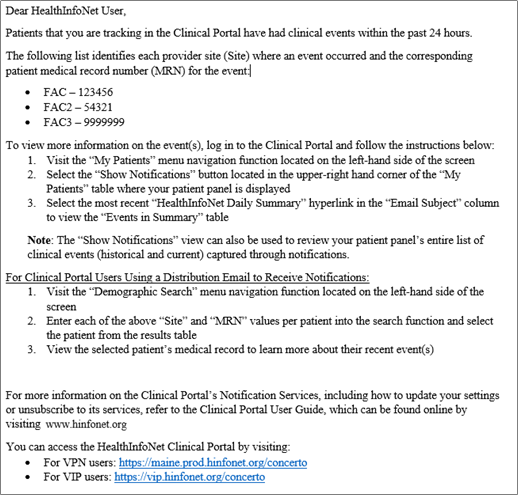 Selecting the "HealthInfoNet Daily Summary" hyperlink in the "Email Subject" field will produce a new "Events in Summary" table displaying all of the events for the selected patient within the last 24 hours from the summary's delivery.